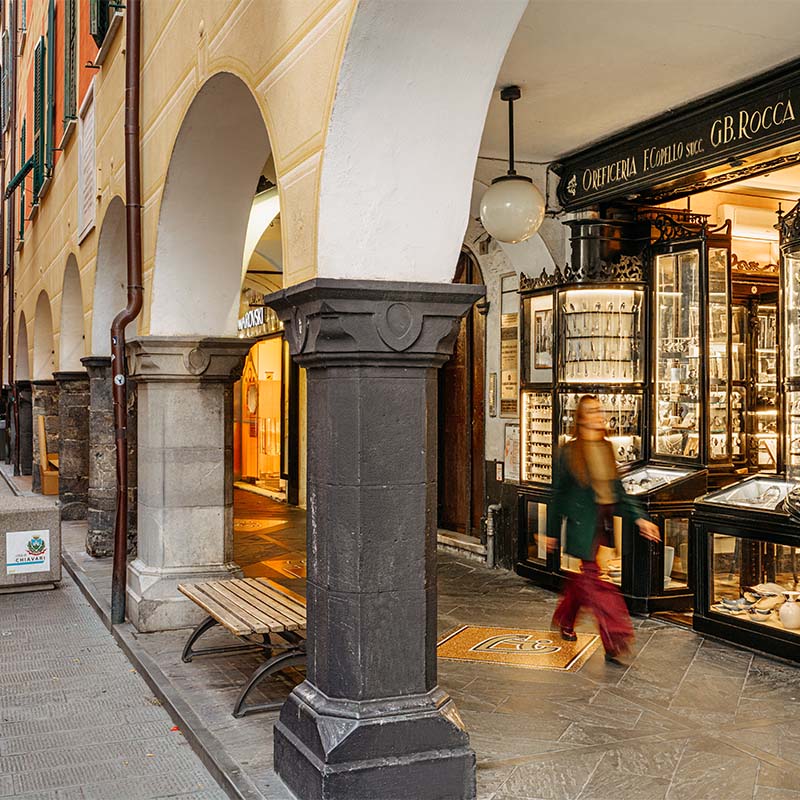 ChiavariL’Oreficeria Rocca nasce nel 1893, quando F. Copello, tornato dall’Argentina, incarica l’artigiano Foppiano, che ha il suo laboratorio in Via Entella, di costruire in Martiri della Liberazione, il famoso carruggio dritto, una oreficeria con le vetrine a scomparsa.