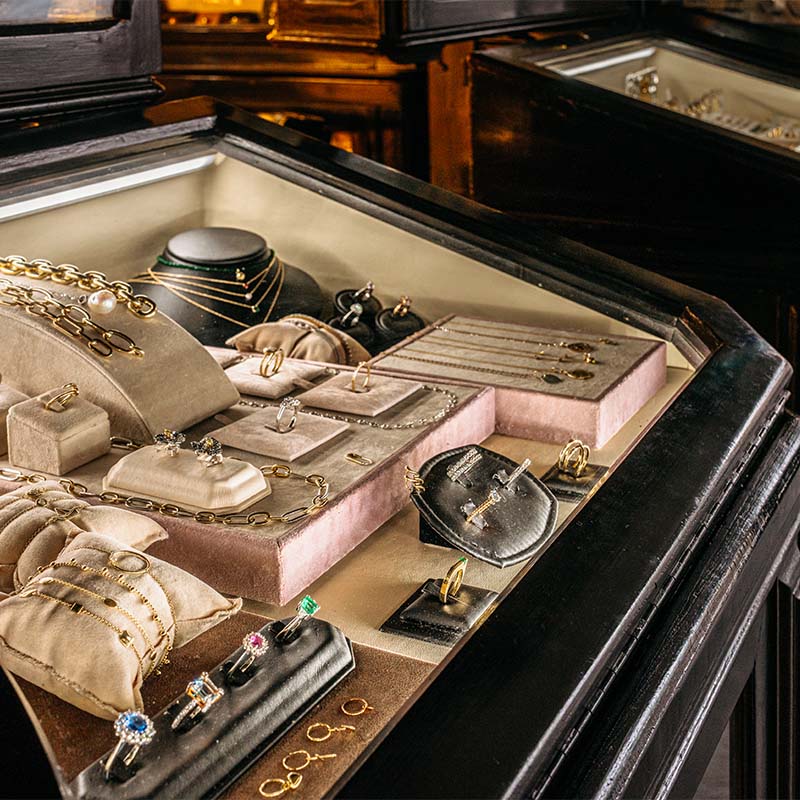 Una volta costruito, il negozio risulta essere esso stesso un gioiello, con le vetrine che ruotano su se stesse, scorrendo su guide metalliche che possono essere addirittura inserite per intero nella retrostante cassaforte.